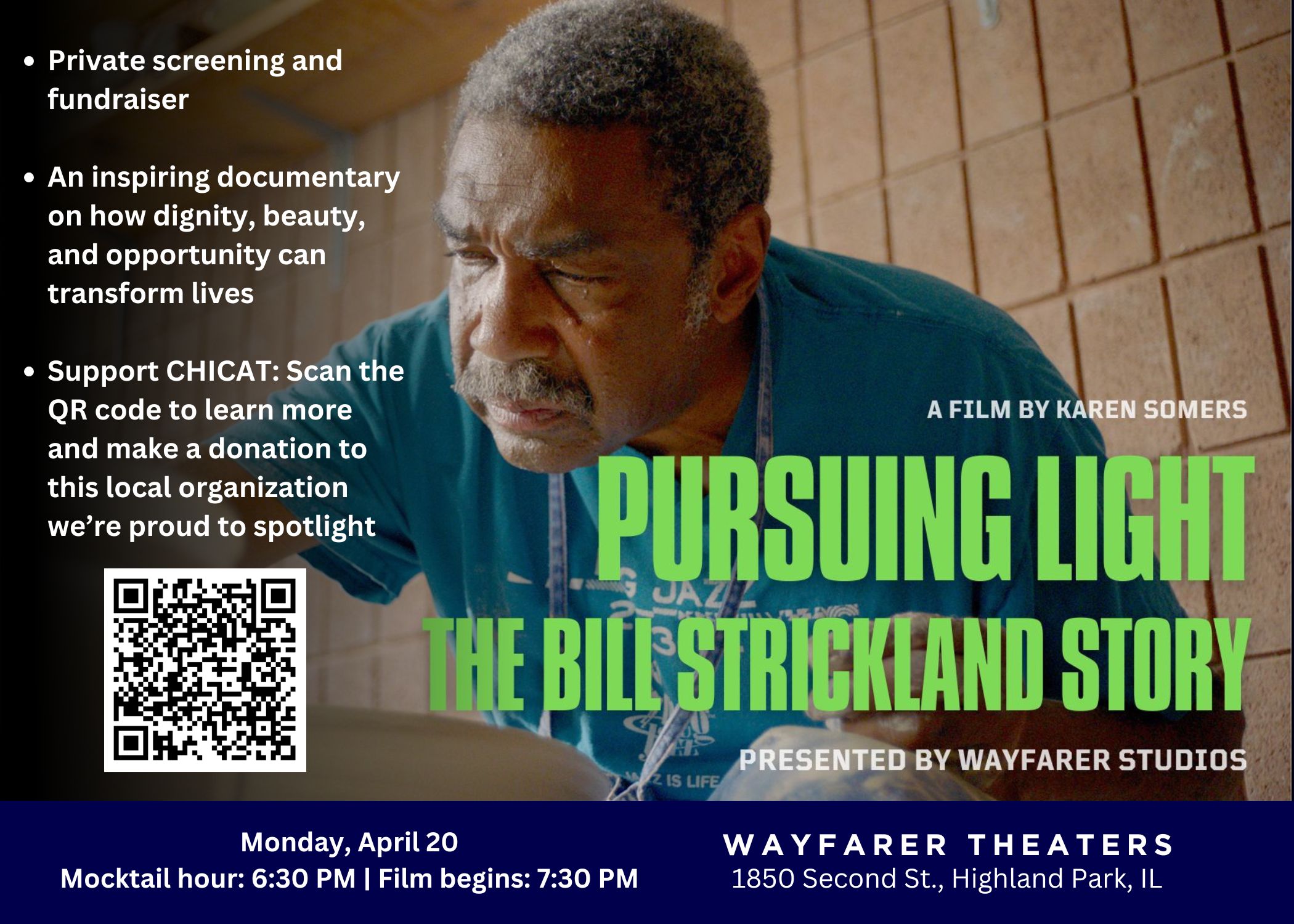 Monday April 20th Wayfarer Theaters hosts a special VIP screening and fundraiser. Join us for the north shore premiere of the inspirational documentary Pursuing Light: The Bill Strickland Story.