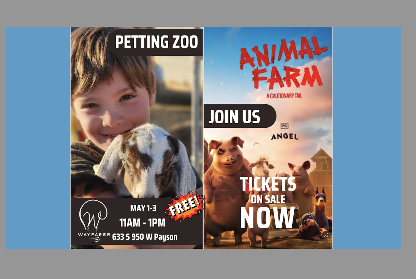 Join Wayfarer Theaters Payson as we open Angel Studios newest film Animal Farm. We are celebrating by partnering with Taylor's Traveling Troupe<div>to offer a free Petting Zoo experience for the community. <div>The petting zoo will take place May 1st through 3rd from 11am -1pm </div><div>Admission is Free. </div><div>Attendees are encouraged to check out Animal Farm in theaters May 1st </div></div>PT2H2026-05-01Animal Farm: Petting Zoo Event"Animal Farm: Petting Zoo Event"Showtimes